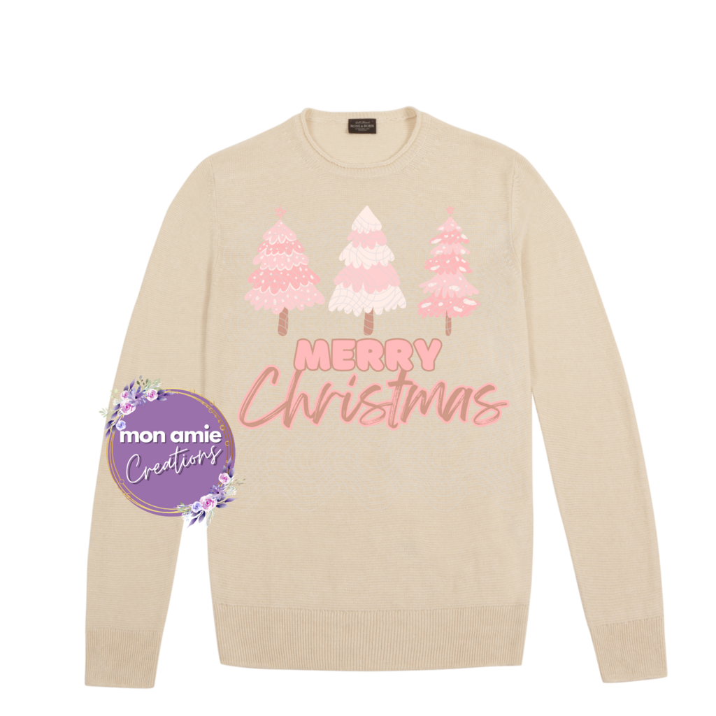 Pink and cream Merry Christmas sweatshirt on beige. Original design by Mon Amie Creations. All Rights Reserved.