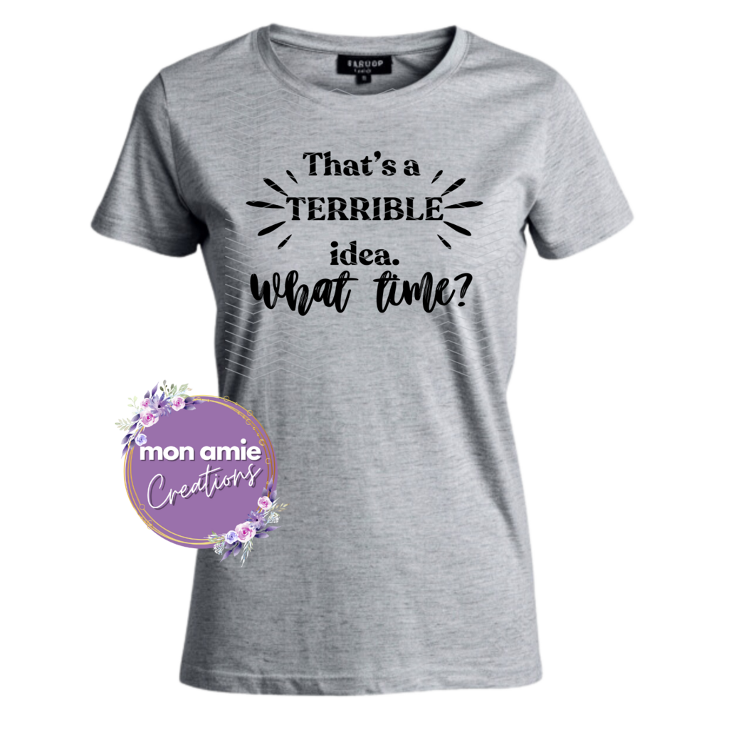 Fun and snarky terrible idea- what time? Makes a great gift. Original design by Mon Amie Creations. All Rights Reserved.